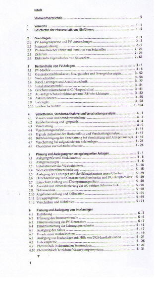 Inhaltliche Schwerpunkte bilden die fach- und normgerechte Planung, der Bau, die Montage, Wartung und das Monitoring von PV-Anlagen – netzgekoppelt und als Inselsysteme. Ebenso anschaulich und praxisnah vertieft der Leitfaden die Themen Netzanschluss, (Eigen-)Verbrauch von Solarstrom, Baurecht, Brandschutz, Recycling und die Abnahme von Anlagen. Hinzu kommen die Vorstellung von Simulationsprogrammen, Betrachtungen zur Wirtschaftlichkeit sowie Informationen zu Steuern und Versicherungen.
